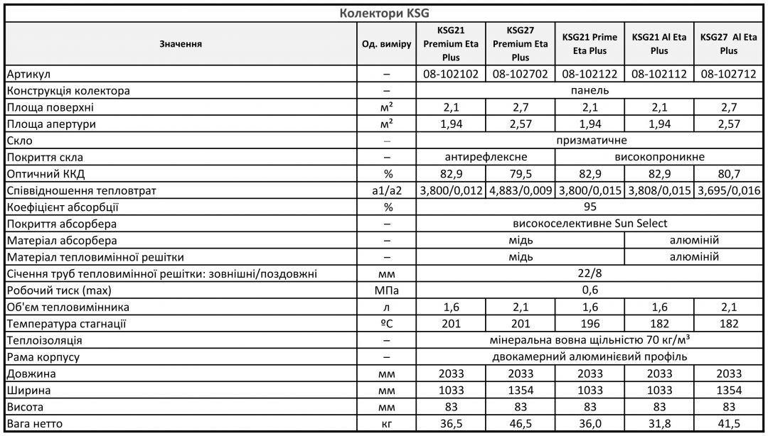 Геліоколектори KSG Al Eta Plus мають високу оптичну продуктивність - не нижче 82,9% згідно випробувань "AIT". Реальні тепловтрати становлять не більше 3,7-3,9%. Володіють сертифікатами «Solar Keymark» та «Din Gepruft» з щорічним регламентом підтвердження технологічних параметрів продукції.