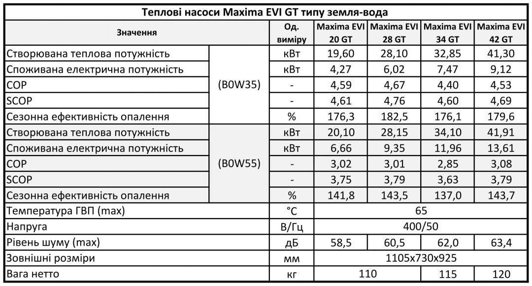 Високотемпературні (до 65°С) теплові насоси Galmet™ геотермального типу серії Maxima GT з компресором алгоритму EVI. Супер-ощадливий клас енергоспоживання А++. Коефіцієнт перетворення (COP) - до 4,67. Компресор Copeland Scroll EVI (intermediate vapour injection) з проміжним вприскуванням пари значно покращує ефективність роботи теплового насоса у порівнянні з класичною технологією перетворення. Функція Soft Start (плавний старт). Кольоровий дисплей ecoTronic100 Touchscreen. Погодозалежний контроль з виносним давачем. У стандартній комплектації інтернет-модуль та кімнатний термостат. Посідає сертифікат EHPA-Q. Гарантійний термін - 60 місяців.